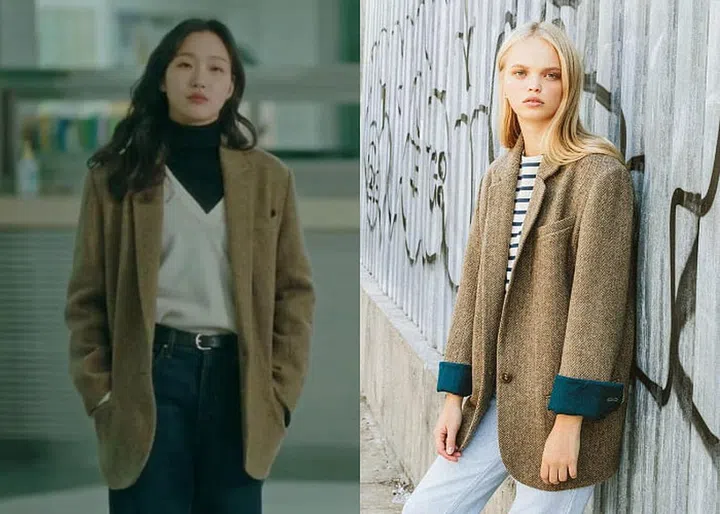 Fun fact: the same blazer was said to be worn by Park Shin-hye in Memories Of Alhambra, which starred Hyun Bin. Kim chose to wear it uncuffed while Park cuffed it to show off the emerald green interior - two ways you can style a well-designed blazer.