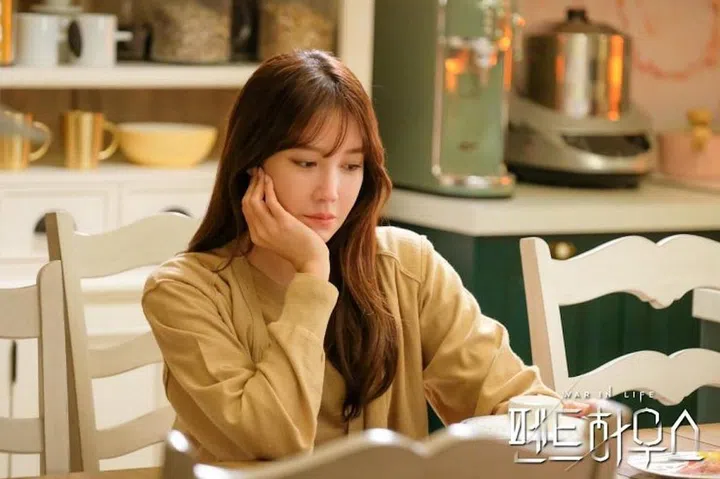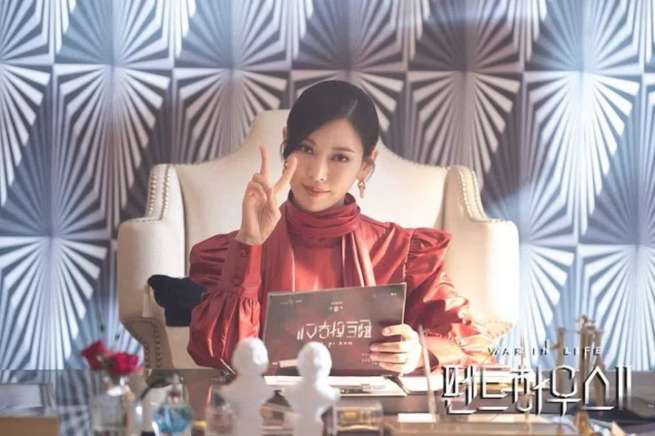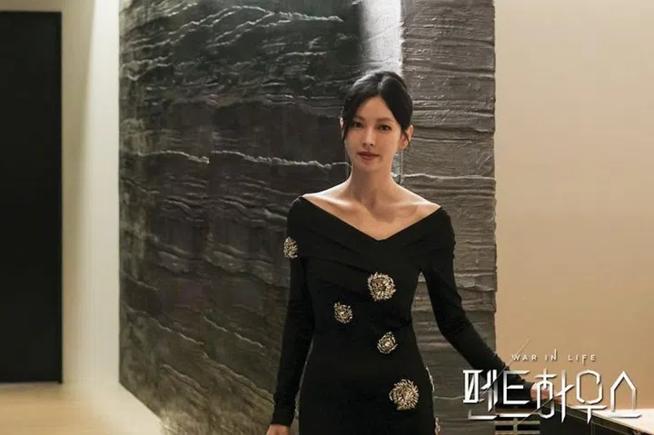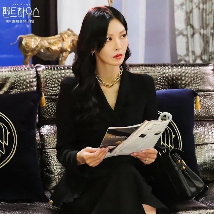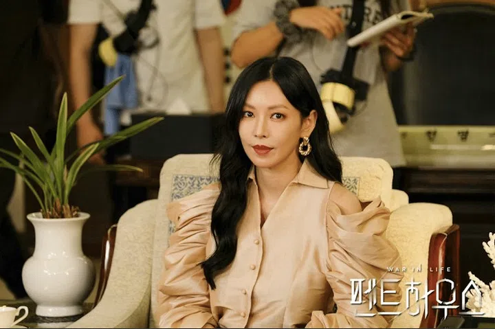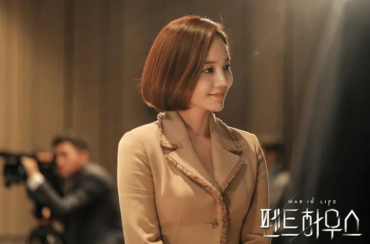 Lee Ji-ah appeared on the first episode wearing a demure dress with a pale pink shawl that fell to the ground, showing off the demeanour of the queen of the Penthouse.