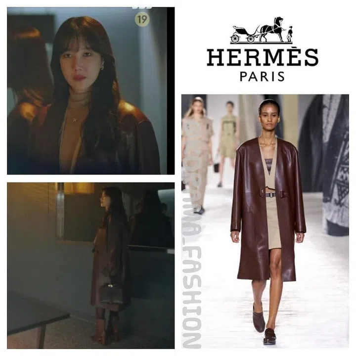 For an understated everyday look. Lee Ji-ah picked up a Hermès Spring/Summer 2021 leather coat and paired it with a Hermès bag.