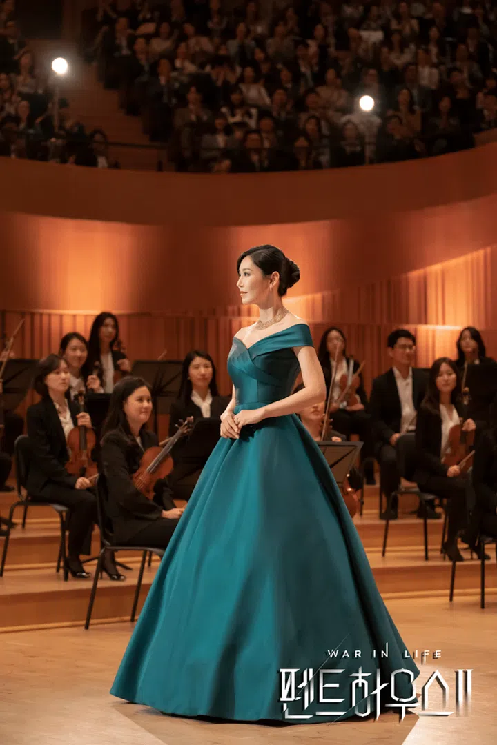 Playing a character who is a renowned soprano singer, Kim So-yeon donned a teal off-shoulder gown from Korean label Phoebe Dress when she performed.