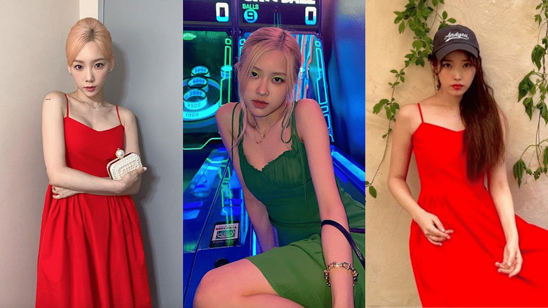 The spaghetti dresses worn by Taeyeon, Rosé, IU and Kim Do-yeon all feature solid colours with no patterns, with bright shades that are just right to accentuate their complexion and demeanour.
