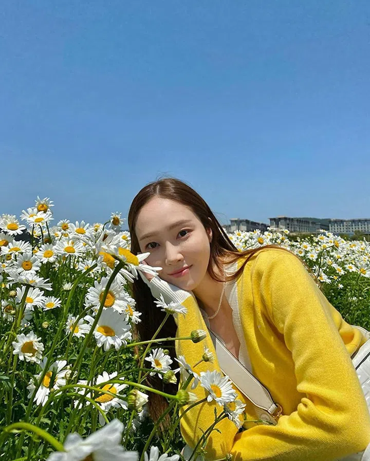 With her bright yellow cardigan and white outfit complementing the flowers and set against the beautiful blue sky, Jessica looks like she's part of a painting here.