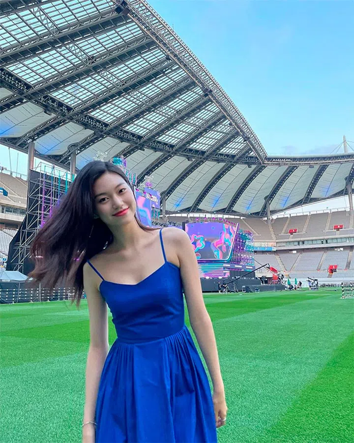 Rosé is wearing a green Reformation dress with a Tiffany & Co. bracelet for a fresh, radiant look. In case you haven't noticed, green has been a popular colour among Korean stars lately.