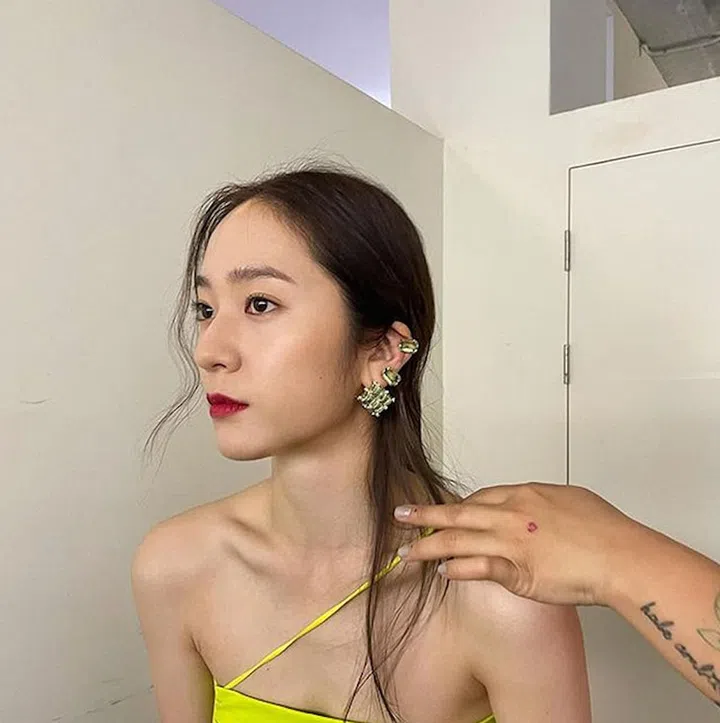 Yellow is one of the colours of 2021, so its popularity shouldn't come as a surprise. Not only is Krystal boldly wearing yellow here, she's also taking it further with chunky Swarovski accessories.