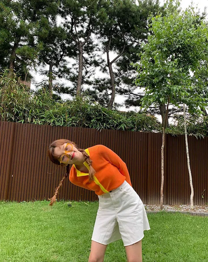 With matching sunglasses, Seulgi's bright orange cardigan with yellow trim is anchored with white bottoms to prevent the overall styling from looking OTT.