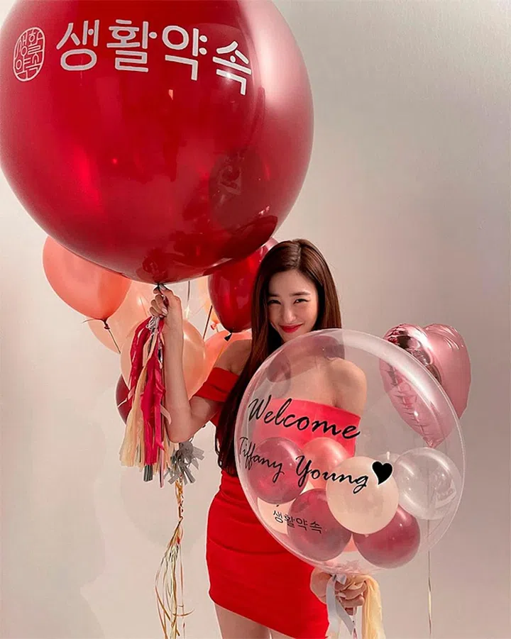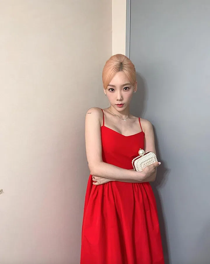 Taeyeon wore a strappy bright red dress before appearing on the variety show Amazing Saturday where she is one of the hosts (alongside Shinee's Key).