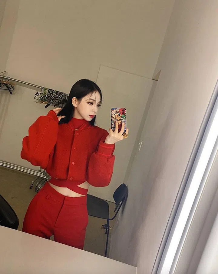 Aespa member Karina is seen here with a cropped aviator jacket and high-waisted trousers from Givenchy, which she complemented with a matching red lip for an avant-garde look.