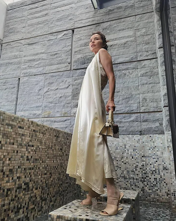 Zoe Tay is wearing an elegant off-white dress from Fendi's Fall/Winter 2021 collection, matched with the Peekaboo ISeeU Stretch long handbag. Her outfit was completed with the popular Fendi First mule sandals and embellished with a striking mini bag charm.