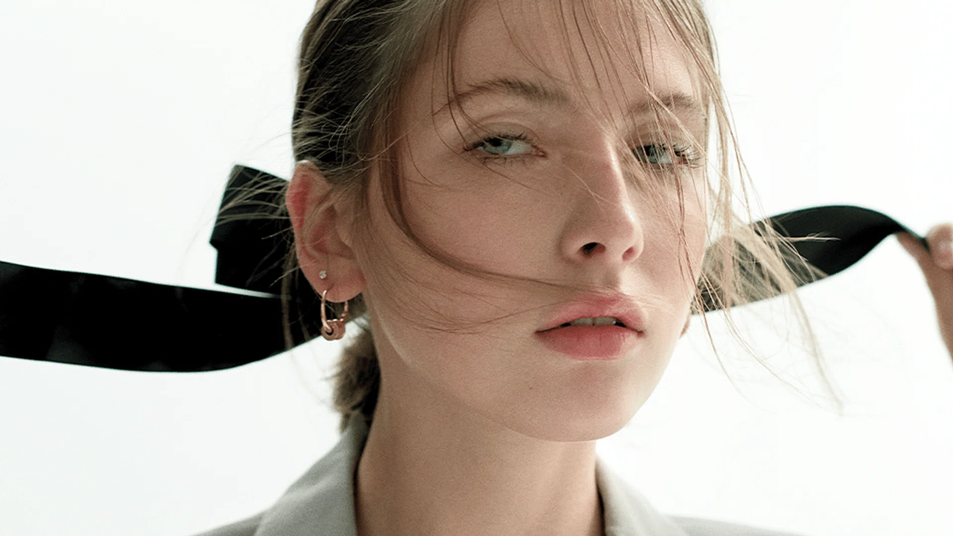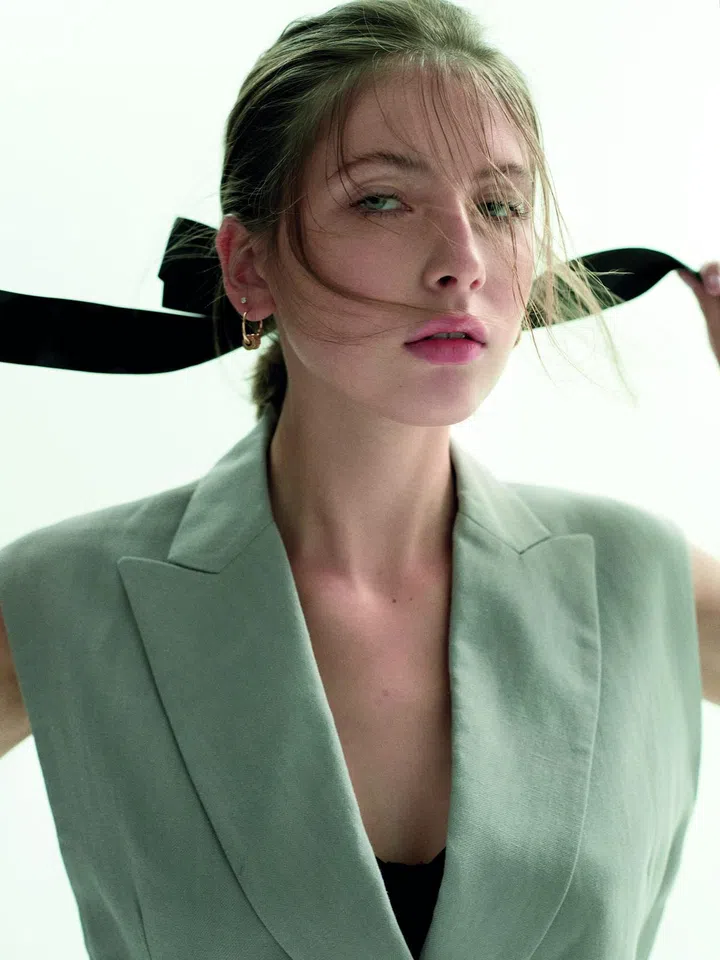 Tailored waistcoat, Brunello Cucinelli. B.Zero rose gold hoop earrings, Bvlgari. Oversized ribbon, stylist’s own