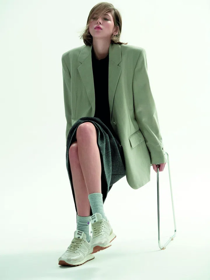 Cotton-blend oversized blazer, Prada. Long-sleeved top, Hermes. Wool midi skirt, Dior. New Balance 574 x Miu Miu vintage-effect nappa leather sneakers, Miu Miu. Socks, stylist’s own