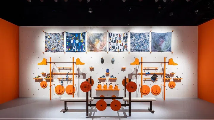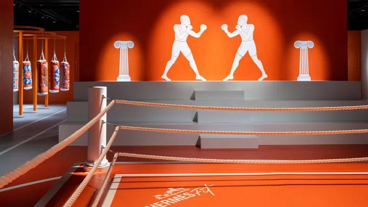 Located in the heart of Orchard Road, the playful space is vividly decorated in the house’s signature orange with specialised rooms for workout classes, a weights wall — complete with custom Hermès barbells and kettlebells, a silk-inspired calisthenics course, a boxing ring that doubles as a photobooth, a juice bar, and much more.