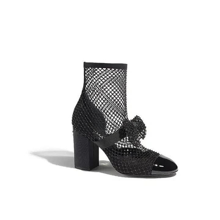 Seen in just about every look in this collection, these ankle-high boots give the illusion of a fishnet that’s been worn over a pair of heels.