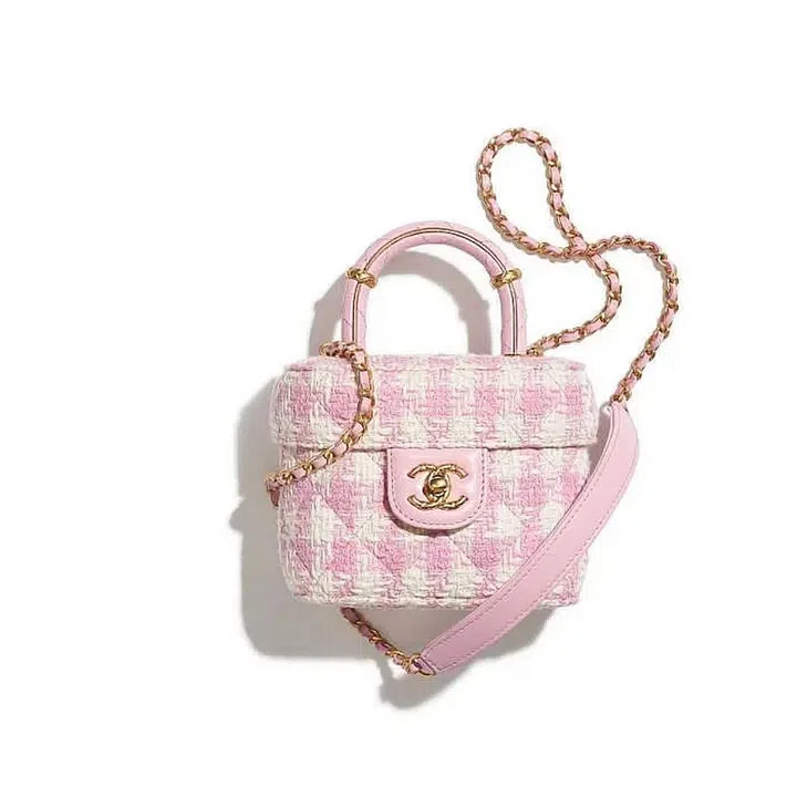 We are wigging out over how cute this petite vanity case draped in pastel pink houndstooth tweed. Note the strip of leather on the strap to make carrying the bag more comfortable.