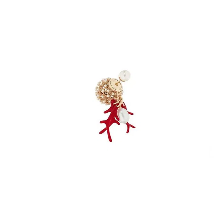 Love the underwater world? Then you will like this earring that’s adorned with white resin pearls and charms featuring a red lacquered coral and a single freshwater pearl.