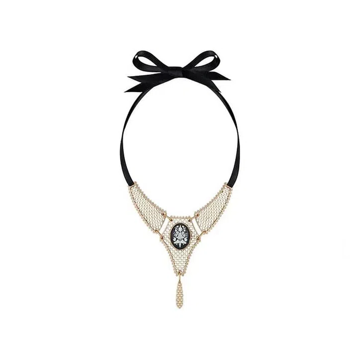 With Catherine de Medici as muse this season, it’s natural that the jewellery will have a regal influence. Clock this medieval-looking collar necklace, which features a resin pendant set on a mesh frame. The grosgrain ribbon fastening adds to the fairy-tale vibes.