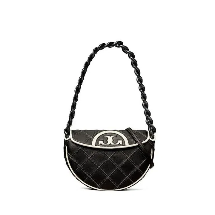 All the bags in the Fleming bag range feature the diamond-shaped quilting and either a metal chain or leather strap. This elliptical version of the bag features white leather trimmings and a black metal chain that has a glossy matte finish.
