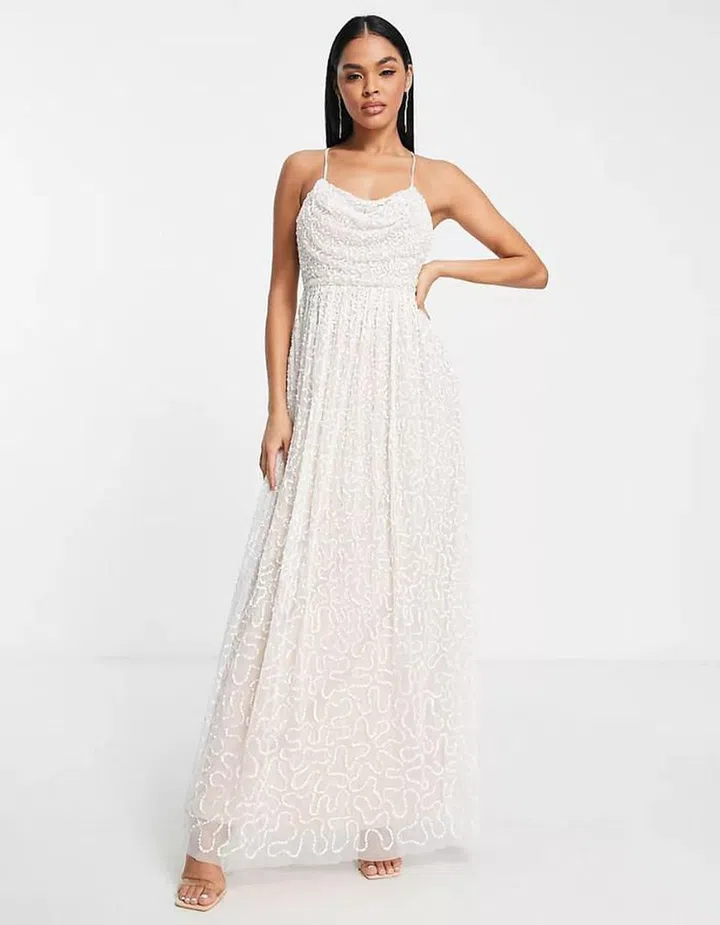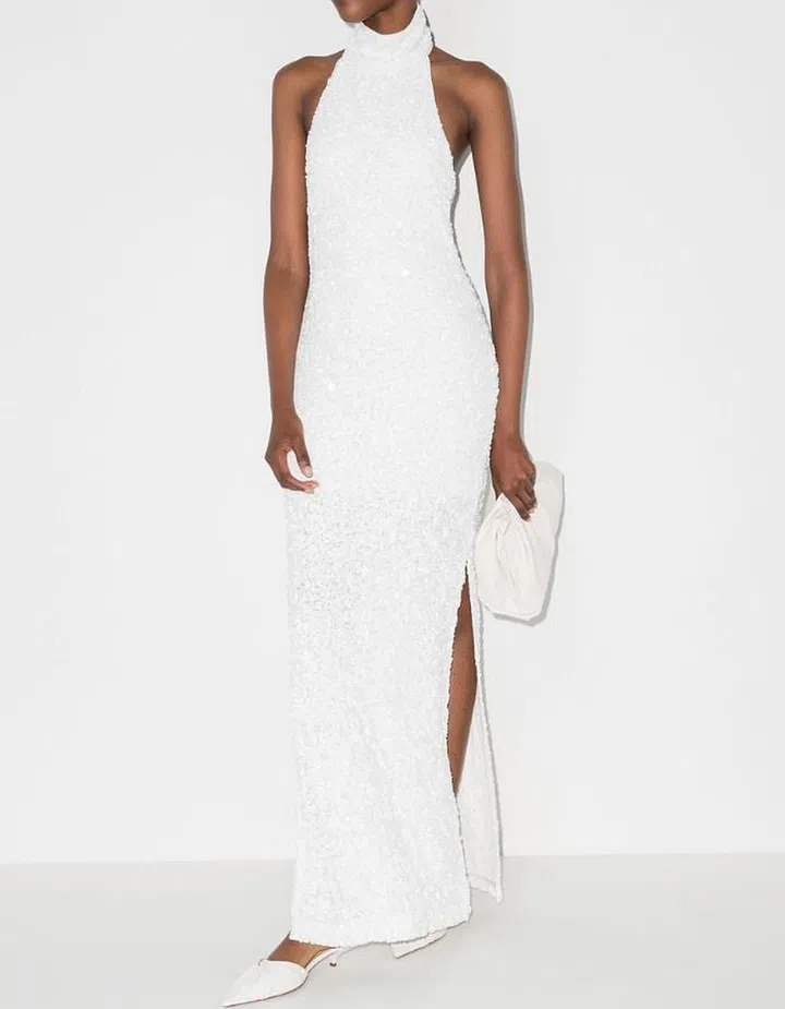 A sequinned bridal dress under $500? You’ve got it. From cool-girl label Rotate comes this sleeveless and slit-up-to-thigh number. Minimalist? Sure, but this is far from boring, thanks to the all-over sequinned handiwork that elevates the look.