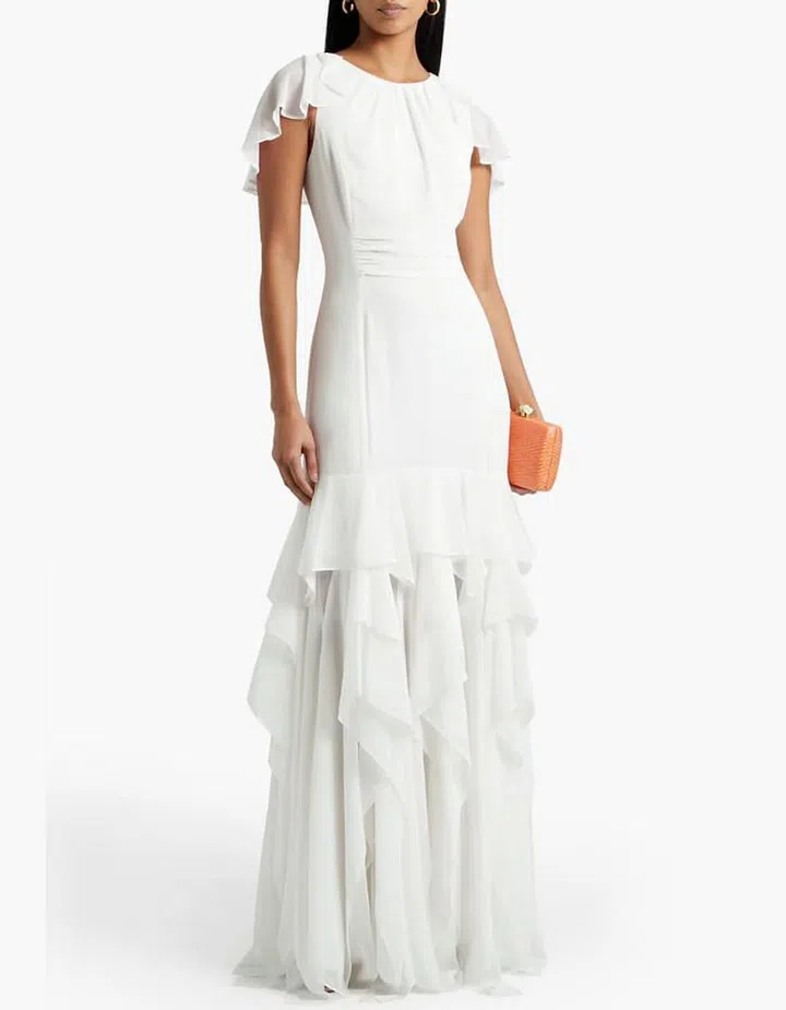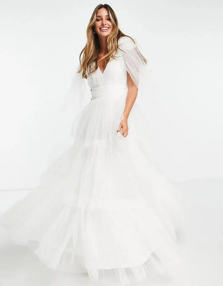 With cascades of ruffles adding that subtle drama (just think of how pretty you’ll look as you have your first dance!), this Halston number offers a fail-safe option that’s charmingly girlish. Plus, it’s cut a little looser than most dresses, so you can choose to size down for a more fitted look, or stick to your original size if you’re planning to have a well-deserved bigger helping of wedding cake.