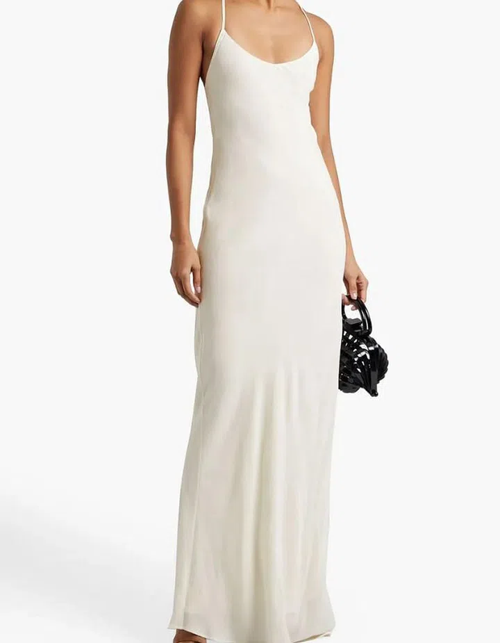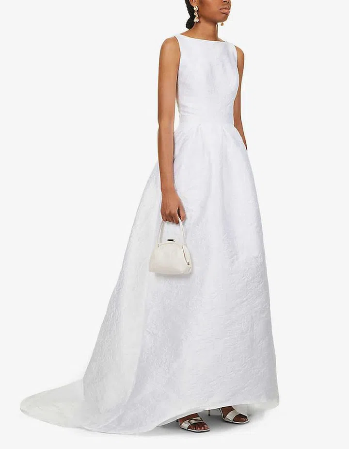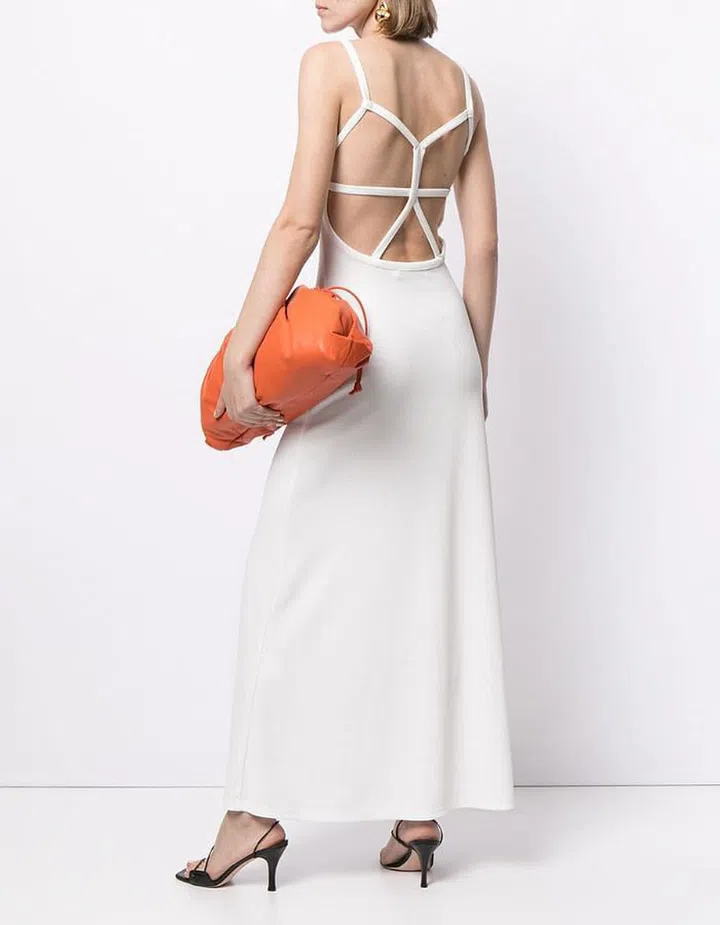 Another It girl brand giving you a stunning option for your nuptials is Christopher Esber. From the front, it’s deceptively simple. Turn around to the back, and harness-like backstraps will attract their share of oohs from the crowd.