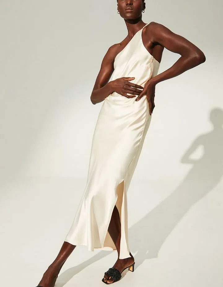 One of the recurring silhouettes we’ve found while sussing out affordable bridal dresses is the classic slip. Here, it’s done in a piece of beautifully delicate crepe fabric, and gives you a blank canvas to accessorise with your fave jewels.