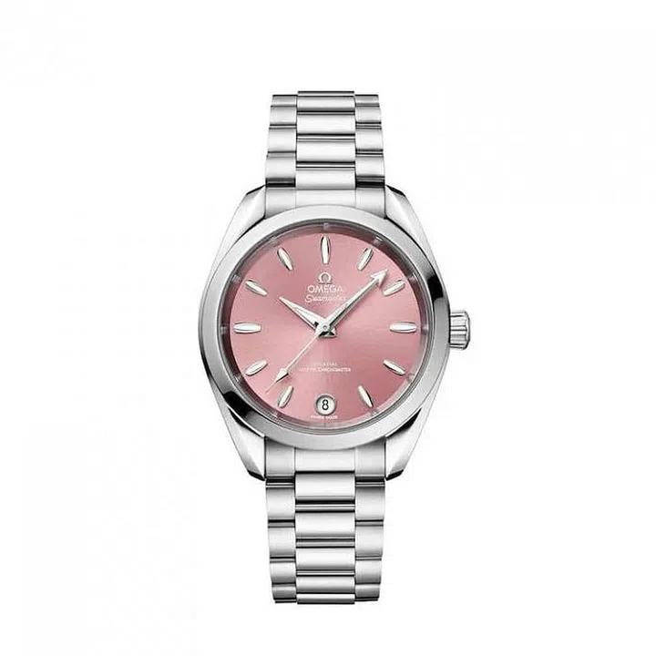 Under this sweet, shell pink dial lies some serious horology. The calibre 8800 is a Master Chronometer, which means it is double certified by the COSC as well as METAS, the latter comprising another eight tests that include magnetic resistance. The date window, hands, indexes and Omega logo are polished 18k white gold, and the bracelet is interchangeable. All of this is packed into a dainty 34mm steel case.