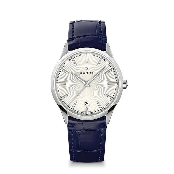 For those who prefer their tickers on the gender-neutral side, Zenith offers sharp styling in its 40.5mm steel Elite Classic. A sunburst patterned dial in blue or silver is accented by faceted and polished hour markers, dauphine hands, and a date window at 6 o’clock. It is powered by the Elite 670 SK self-winding movement, which provides 48 hours of autonomy.