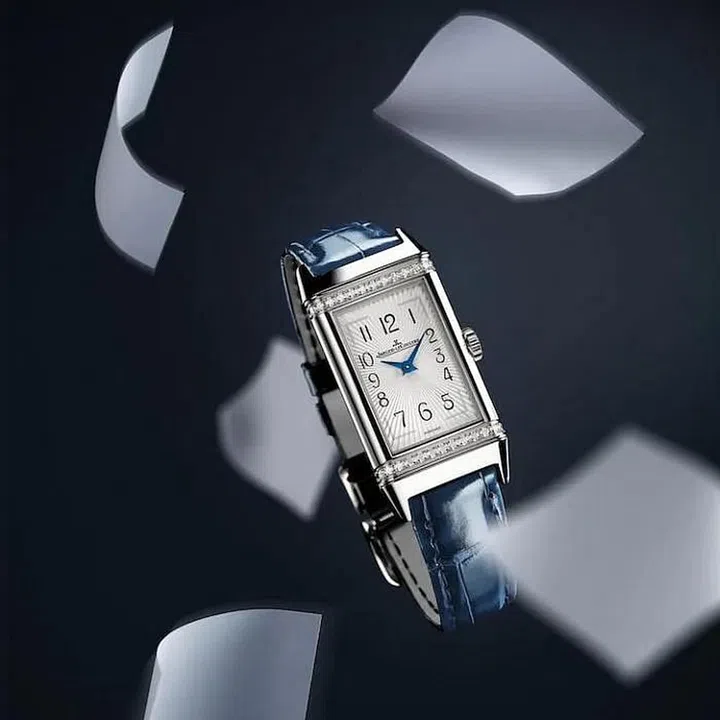 Narrower than the classic Reverso watches, the Reverso One was based on the ladies’ versions of this timeless flippable favourite from Jaeger-LeCoultre. Measuring 40.1mm by 20mm, the steel case and diamond-set gadroons frame a silvered grey dial with sunburst guilloche and Arabic numerals.