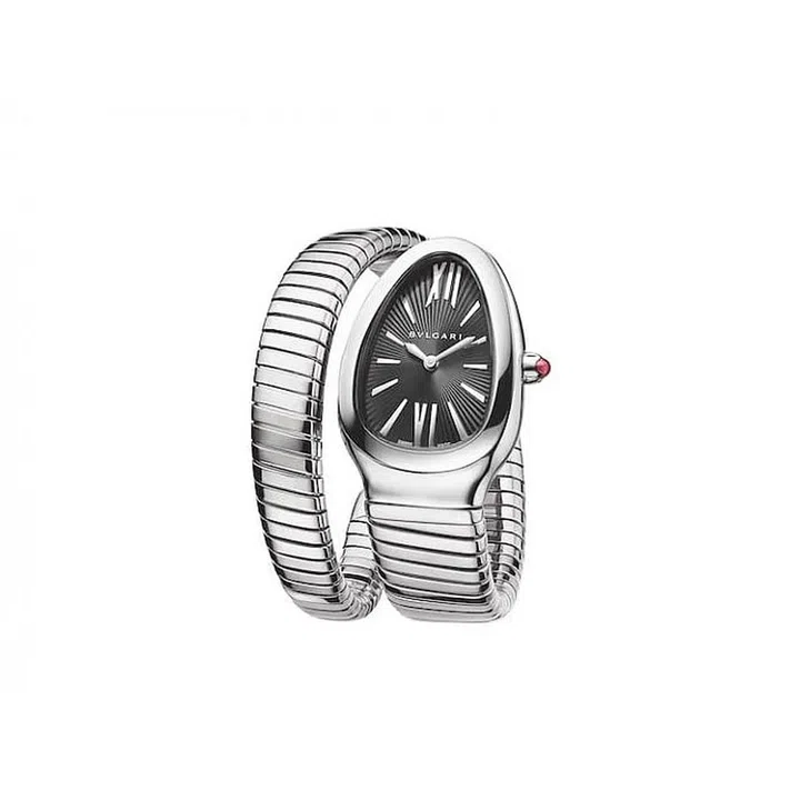 The Italian jeweller’s famous “tubogas” technique was developed in the 1940s and inspired by the way gas tubes were made. By wrapping metal strands around an internal structure without the use of any soldering, Bulgari managed to create a slinky, supple bracelet to embody its beloved motif, the serpent. In this single spiral 35mm steel model, the snake’s head bears a black opaline dial with sunburst guilloche and a crown set with a pink rubellite cabochon.