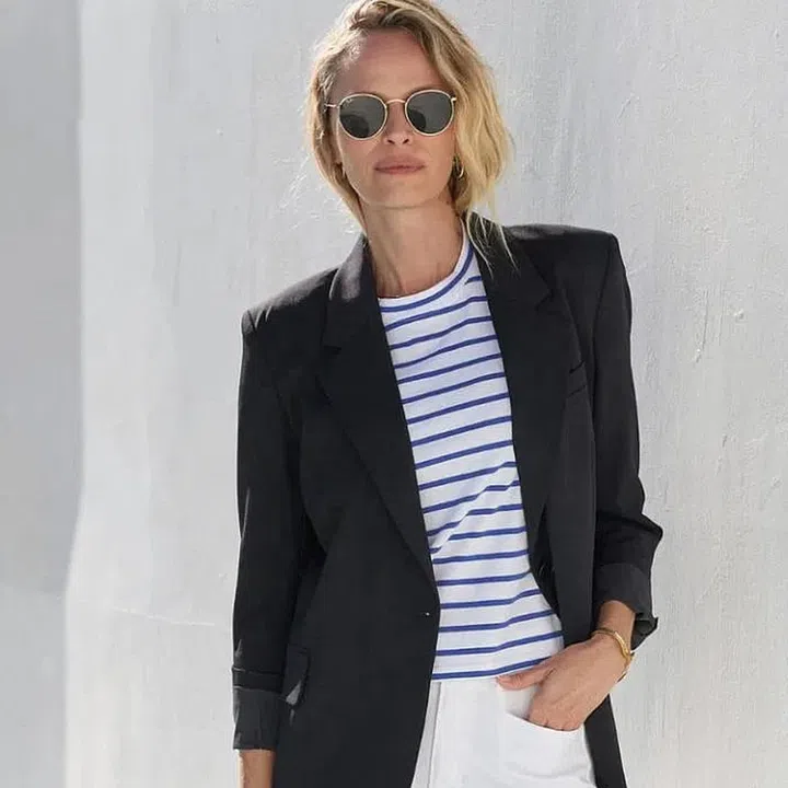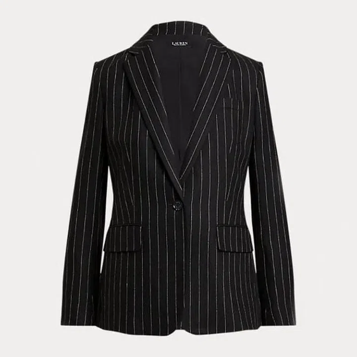 Ralph Lauren, home to some of the most enduring preppy style essentials, makes a black linen blazer that can’t be missed. The cream pinstripes and single-button closure are pure sophistication, but the linen blend feels relaxed and modern. You could go old-school and wear this with wide-leg trousers, but I prefer the spring styling on Ralph Lauren‘s site with matching high-waist shorts and a wide belt.