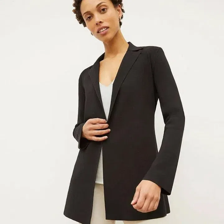 This remixed blazer is an absolute staple for working from home. (I keep one draped over my home office’s desk chair myself.) It’s made with a knitted blend that’s as cozy as a sweatshirt, but it has the same button-closure and fitted shape as a collarless blazer.