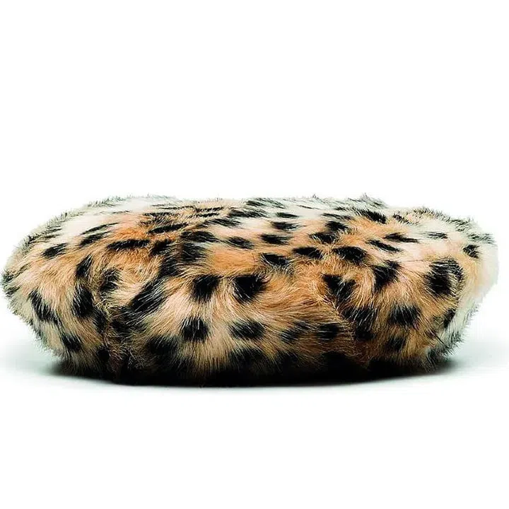 Soften a stark pantsuit with a faux fur beret in a fun hue