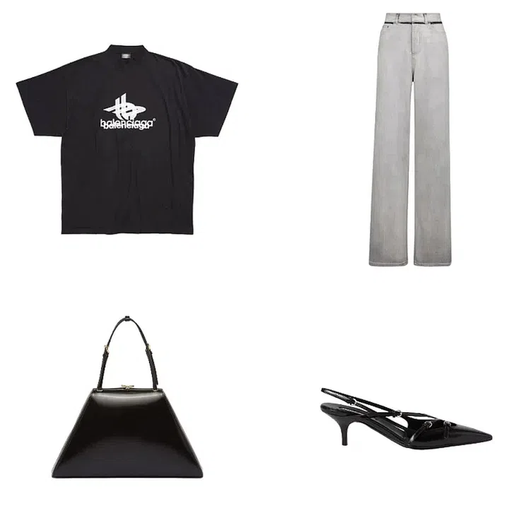 Clockwise from top left: Cotton T-shirt, $1,150, Balenciaga; denim jeans, $2,350, Dior; leather slingback pumps, $1,980, Miu Miu; leather top handle bag, $9,500, Prada