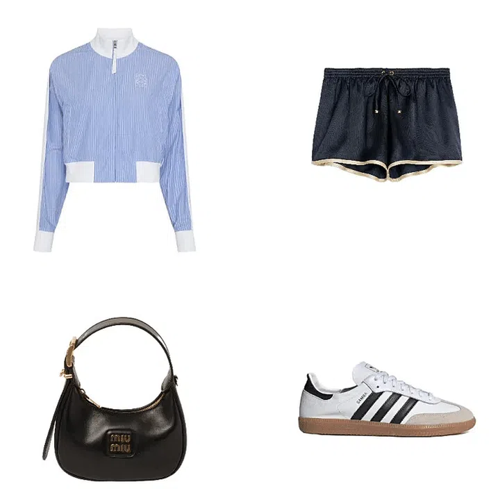 Clockwise from top left: Cotton jacket, price unavailable, Loewe; Celine by Hedi Slimane viscose shorts, $1,250, Celine; Samba Decon leather sneakers, $329, Adidas; and leather hobo bag, $3,550, Miu Miu