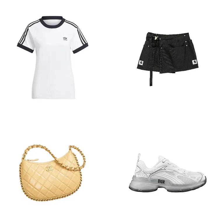 Clockwise from top left: Cotton T-shirt, $59, Adidas; Sacai x Carhartt VIP cotton mini skirt, price unavailable, Dover Street Market Singapore (available from Sep 8); technical fabric sneakers, $1,690, Dior; and lambskin hobo bag, $7,080, Chanel