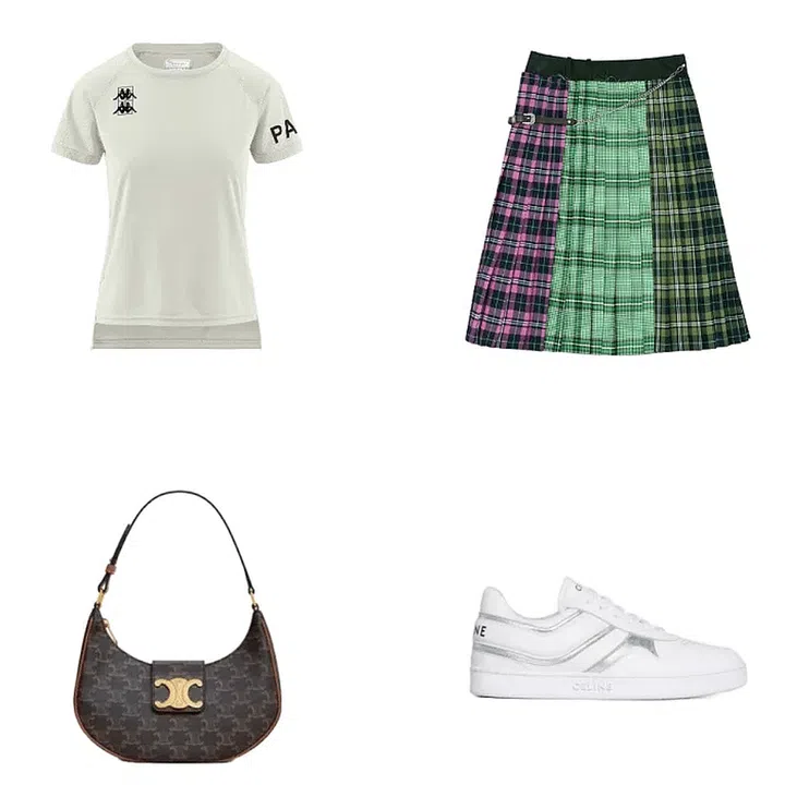 Clockwise from top left: Polyester t-shirt, €35 (S$51.79), www.kappa.com; polyester-blend skirt, $1,202, www.adsb.co.kr.com; Celine by Hedi Slimane calfskin leather sneakers, $1,200, and Ava Triomphe canvas shoulder bag, $3,200, Celine