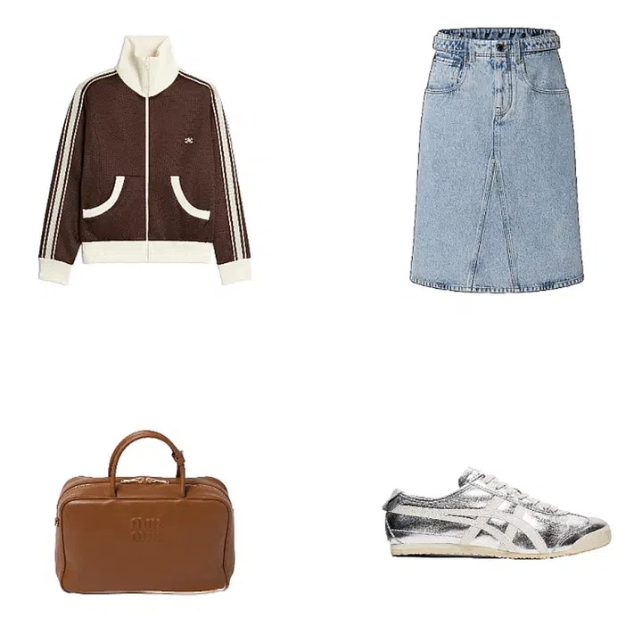 Clockwise from top left: Celine by Hedi Slimane polyester jacket, $2,450, Celine; denim skirt, $2,450, Louis Vuitton; Mexico 66 leather sneakers, $170, Onitsuka Tiger; and leather top handle bag, $4,500, Miu Miu