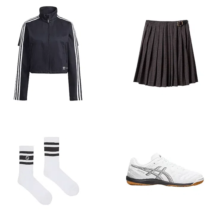 Clockwise from top left: Cotton jacket, $119, Adidas; wool skirt, $3,450, Miu Miu; Calcetto WD 9 faux leather sneakers, $99, Asics; and cotton socks, $360, Gucci