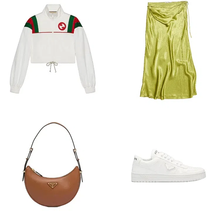 Clockwise from top left: Polyester-blend jacket, $2,650, Gucci; acetate skirt, $640, Acne Studios; leather sneakers, $1,740, Prada; and Arque leather shoulder bag, $3,500, Prada