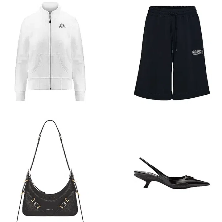 Clockwise from top left: Cotton-blend jacket, €39 (S$57.70), www.kappa.com; Ganni organic cotton-blend shorts, $210, www.club21.com; leather slingback pumps, $1,840, Prada; and Mini Voyou calfskin bag, $2,690, Givenchy