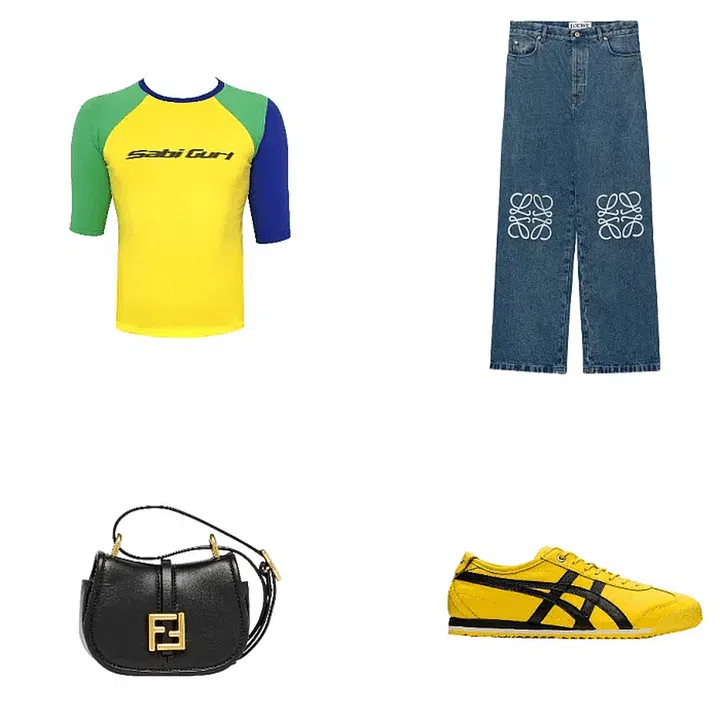 Clockwise from top left: Cotton T-shirt, £80 (S$138), www.mowalola.com; denim jeans, price unavailable, Loewe; Mexico 66 leather sneakers, $170, Onitsuka Tiger; and C’mon mini leather bag, $3,290, Fendi