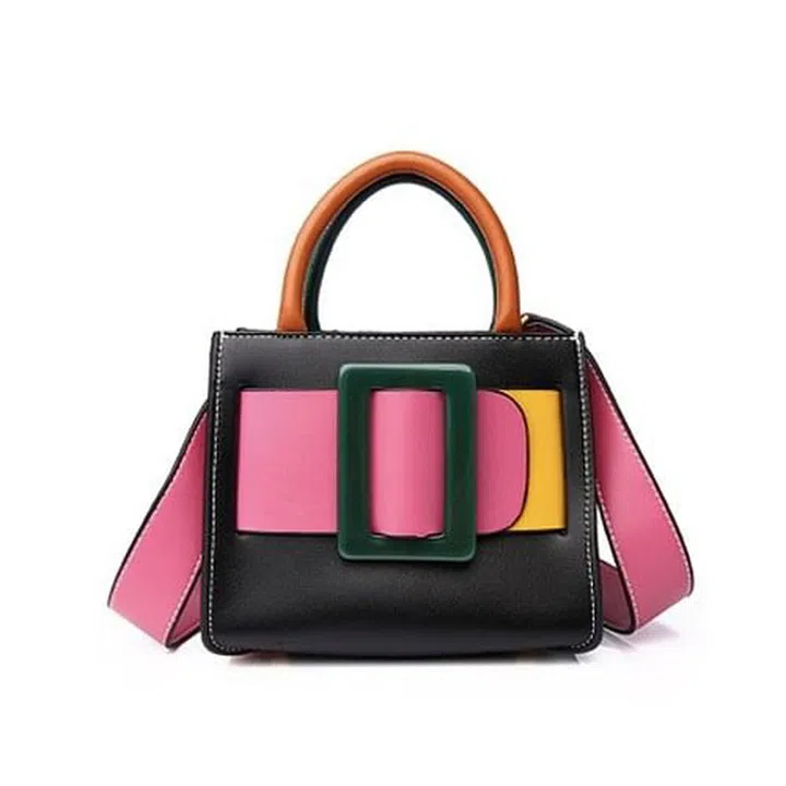 A quirky companion to schlep for both work and weekends, this playful number features a belt-like design replete with a statement buckle. Bright pops of pink, emerald green and yellow add to the retro design, and the bag is finished with contrasting brown and green top handles. It also comes with a detachable shoulder strap in case you wish to carry it hands-free.