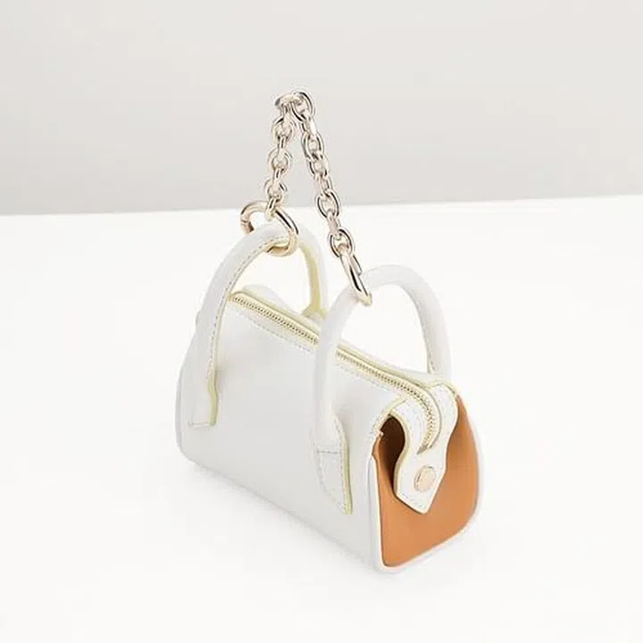 Since bowling bags are trending as yet another silhouette du jour this season, you might as well consider this unique miniature rendition of a soft faux leather bowling bag. Equipped with two stop top handles linked together with a rose gold chain that you can sling around your wrist like jewellery, this cute little bowling bag is rendered in white and features caramel brown side panels while also subtly piped in pastel yellow for a striking effect.