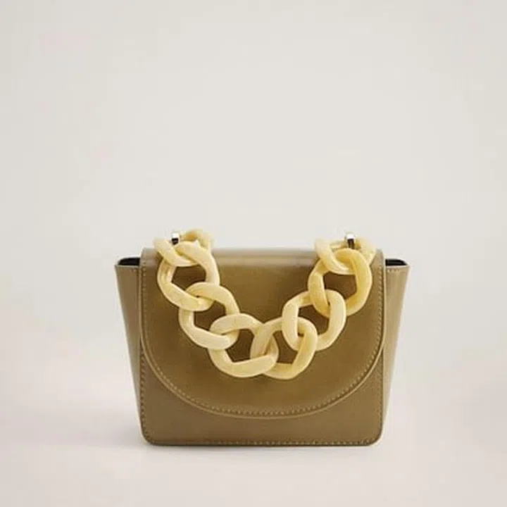 Featuring a standout trend that’s been taking over the fashion world lately, a statement chunky chain-link strap, this boxy olive green bag is designed with an opening that extends at the sides and a foldover front lapel for a contemporary look. Tote it by the yellow resin chain straps when you’re wearing something dressy, or attach the adjustable shoulder strap and schlep it as a crossbody bag on lazier days.