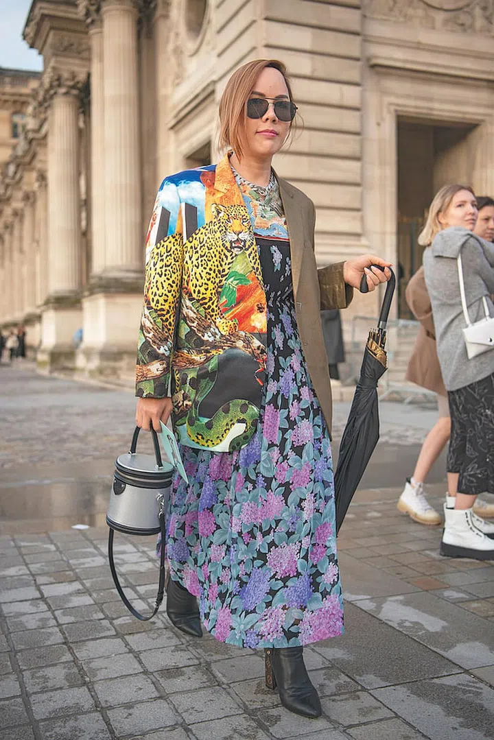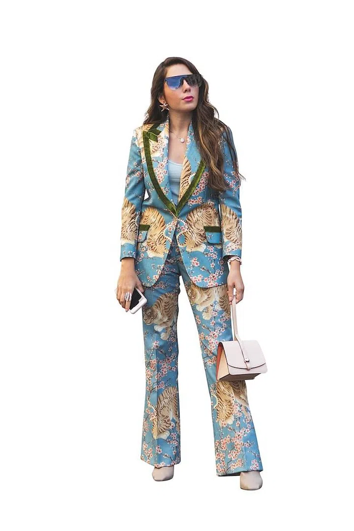 Think pantsuit should only come in one colour? Think again. Go bold by wearing prints from head (or shoulders) to toes.