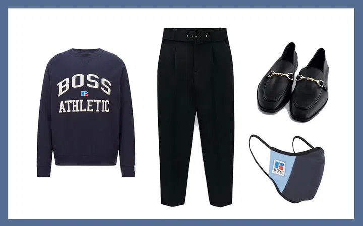 From left to right: BOSS x Russell Athletic Relaxed-fit unisex sweatshirt in organic cotton with exclusive logo, from BOSS (price TBC); High-waist trousers with belt, $69.90 from Zara; Leather loafers with buckle, $99.90 from Zara; BOSS x Russell Athletic Face mask in stretch interlock fabric with exclusive logo, from BOSS (price TBC)