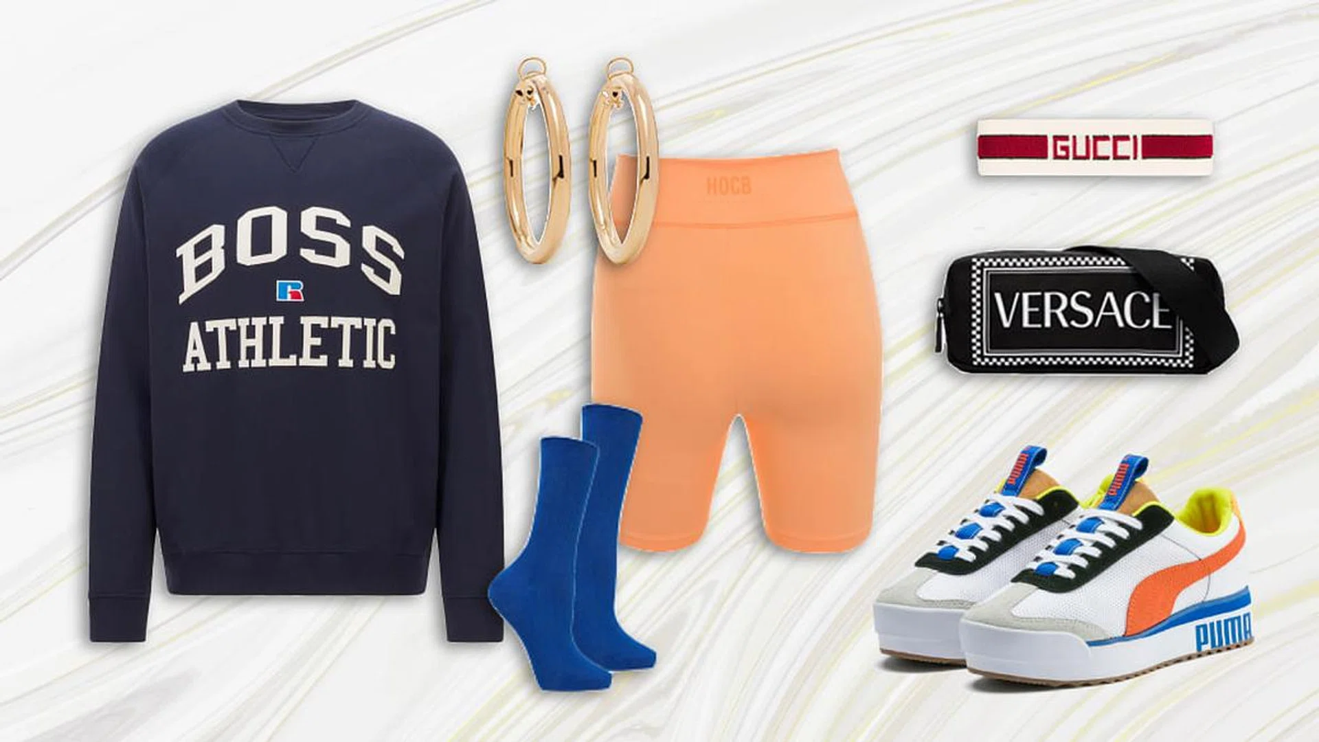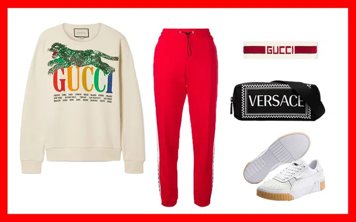 From left to right: Gucci oversized embellished printed cotton-terry sweatshirt, S$1,874.18 from Net-a-Porter; MSGM side logo stripe track pants, S$320 from Farfetch; Gucci printed intarsia-knit headband, S$279.20, from Net-a-Porter; Versace black logo-print belt bag, S$662 from Farfetch; Puma Cali Exotic, S$159