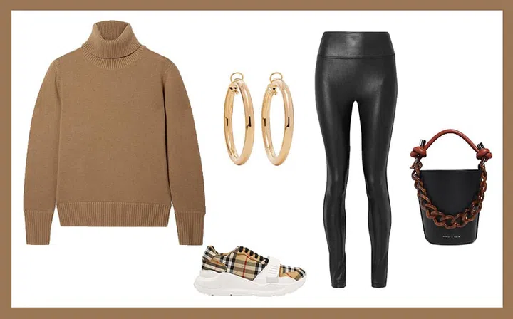 From left to right: Burberry cashmere turtleneck sweater, S$860 from Net-a-Porter; Jennifer Fisher samira gold-plated clip hoop earrings, S$581.22 from Net-a-Porter; Burberry checked canvas sneakers S$482.31 from Net-a-Porter; Spanx faux stretch-leather leggings, S$117.86 from Net-a-Porter; Charles & Keith chunky chain bucket bag, S$69.90