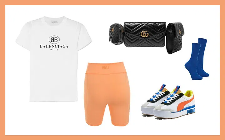 From left to right: Balenciaga logo-print cotton-jersey T-shirt, S$425 from Net-a-Porter; House of CB pastel neon orange cycling shorts, £15.00 (S$26.70); Gucci GG Marmont quilted leather belt bag, US$1,709.91 (S$2,327.02) from Net-a-Porter; Maria La Rosa ribbed organic cotton socks, S$36.85 from Net-a-Porter; Puma Roma Amor Sport, S$165