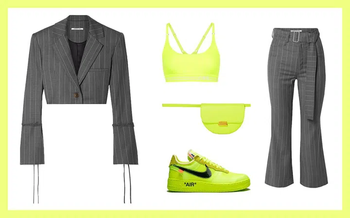 From left to right: Orseund Iris box cropped pinstriped wool-blend blazer, S$987.18 from Net-a-Porter; Nike The 10: Nike Air Force 1 Low, S$1,370 from Farfetch; Adam Selman Sport neon stretch sports bra, S$81.32 from Net-a-Porter; Wandler Anna small neon leather belt bag, S$540 from Net-a-Porter; Nike The 10: Nike Air Force 1 Low, S$1,370 from Farfetch; Orseund Iris cropped belted pinstriped wool-blend flared pants, S$933.76 from Net-a-Porter