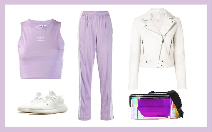 From left to right: Adidas crop top, S$56 form Farfetch; Adidas x Yeezy Boost 350 V2 Cream White, S$575 from Farfetch; Adidas adibreak tracksuit bottoms, S$98 from Farfetch; Pinko cropped leather jacket, S$622 from Farfetch; Dsquared2 reflective belt bag, S$745 from Farfetch